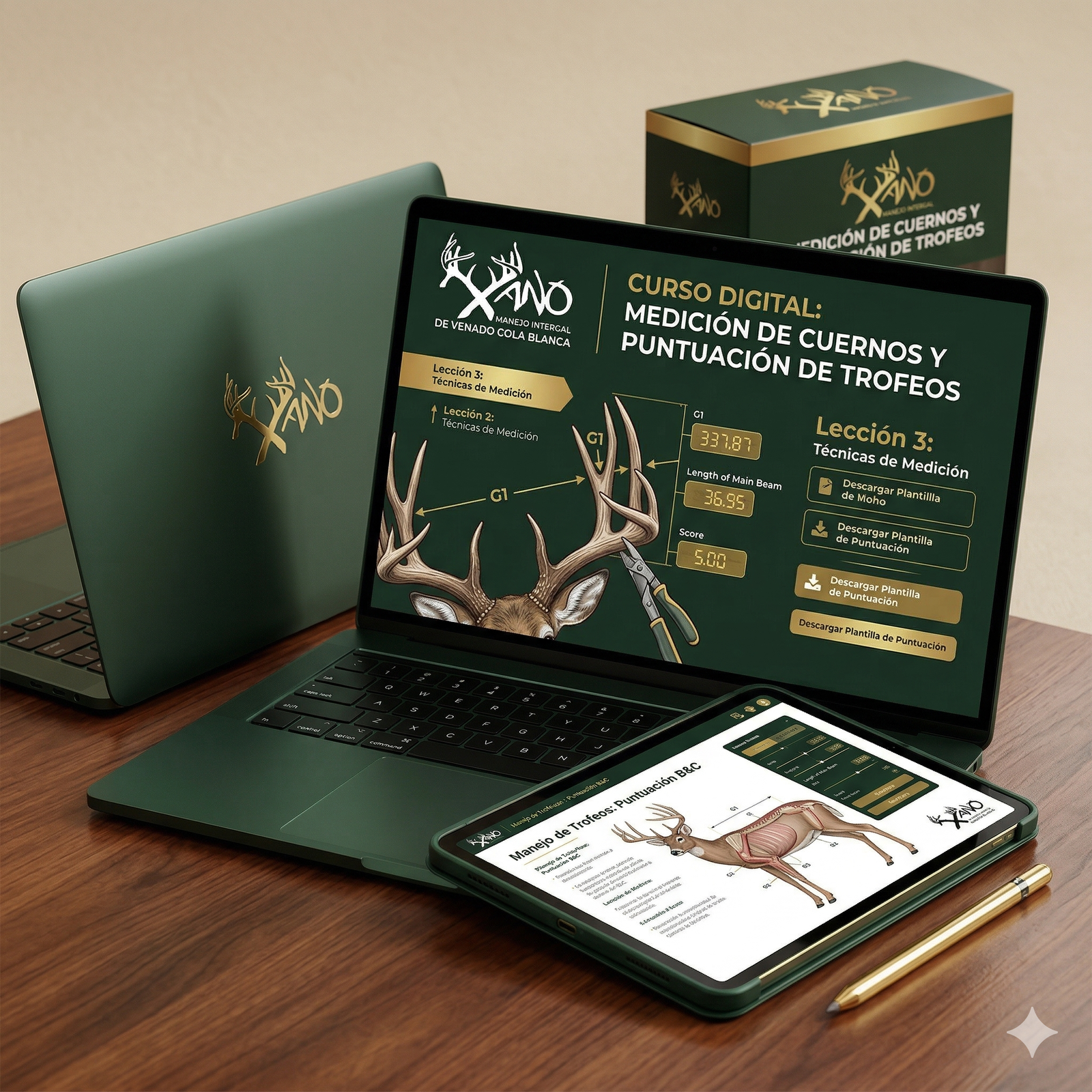 Mini-curso digital sobre medición y evaluación de cornamentas de venado cola blanca. Incluye archivo Excel especializado para registro y cálculo. Acceso inmediato tras la compra.